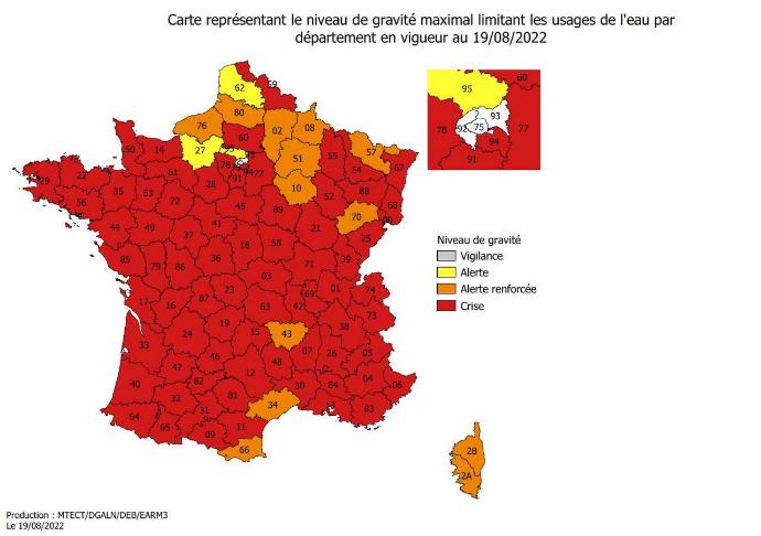 Au niveau national, une large majorité de départements ont été classés en crise cet été, limitant les usages de l’eau pour les particuliers, les entreprises, les collectivités et des exploitants agricoles selon des conditions différentes.