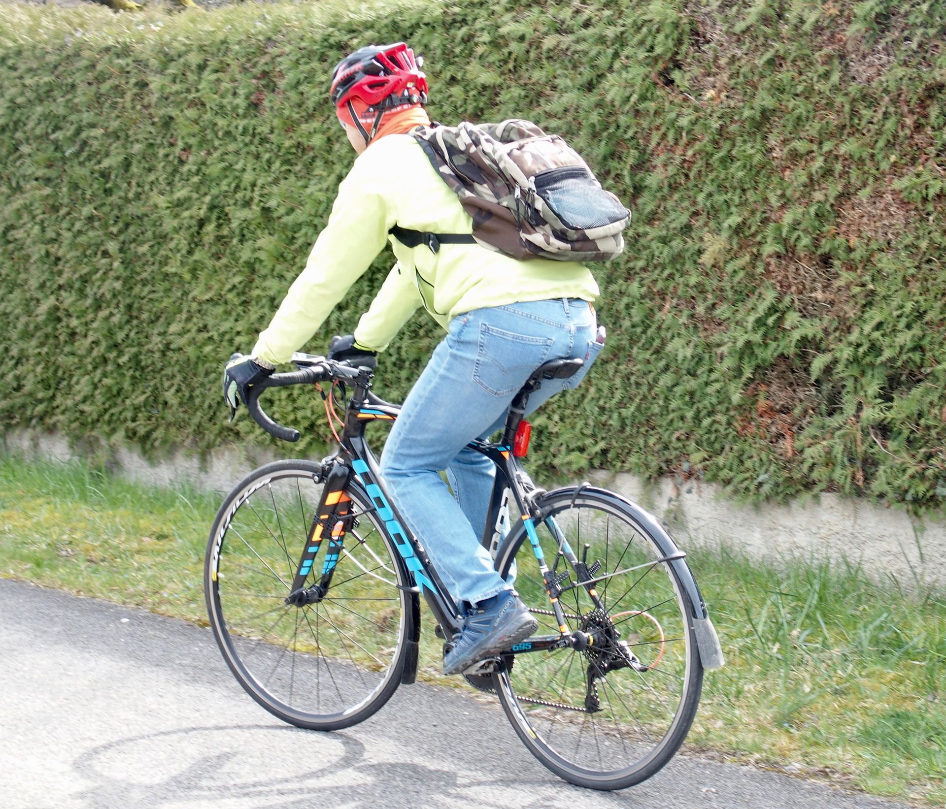 Les intempéries : Pour moi, c'était le plus gros frein, en particulier la pluie. Il faut être lucide, si on espère devenir un vélotafeur, il est indispensable d'investir dans des vêtements adaptés à toutes les circonstances. Les gants et le bonnet sont indispensables l'hiver, des vêtements "transpirants" pour la saison chaude et des vêtements étanches et bien ventilés pour les périodes pluvieuses. Pour ma part, j'ai une paire de chaussures Gore-Tex ® (à la fois étanches quand il pleut, ventilées pour l'été et chaudes pour l'hiver). Pour le haut, je porte une veste coupe-vent et waterproof (étanche) de la marque Odlo qui me sert toute l'année. Dessous, un gilet en matière polaire est un très bon compromis. En plus, en arrivant, si j'ai un peu chaud momentanément, je peux l'enlever sans me décoiffer 😁. En bas, je porte un jean en toute saison. Lorsqu'il pleut, j'ai un sur-pantalon Cintamani totalement étanche avec un système d'ouverture sur les côtés permettant de le mettre et de l'enlever sans avoir à se déchausser.