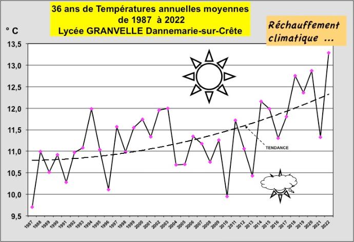 2023 semble à nouveau partir sur des bases élevées niveau température. Petit rappel de l’évolution de la température moyenne annuelle de la station de Dannemarie :