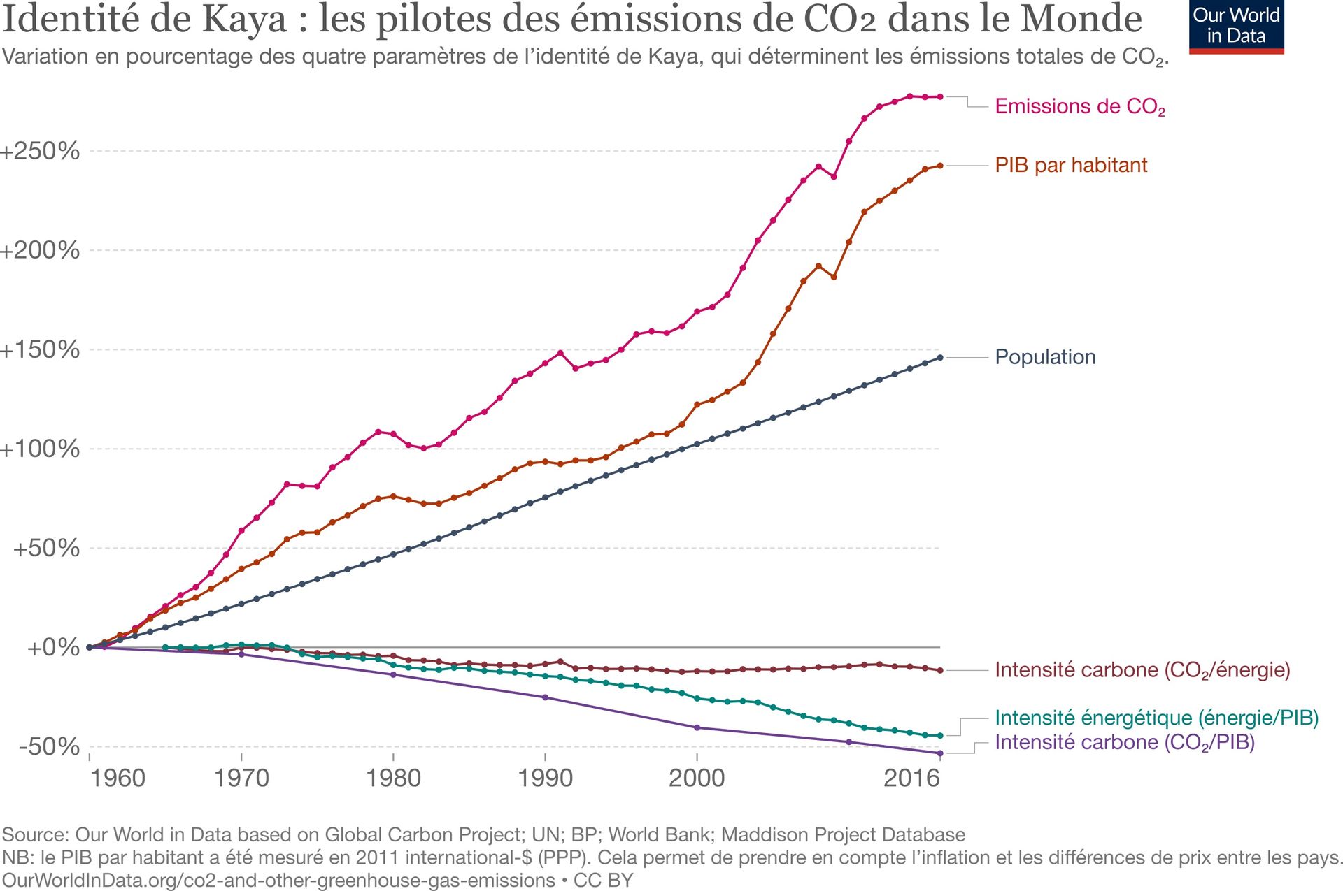 Cet article ne cherche pas répondre à la question du comment atteindre cet objectif, mais plutôt d’essayer d’imaginer les conditions d’un monde avec -50% d’émissions de CO2. C’est là que la relation de Kaya peut nous aider…