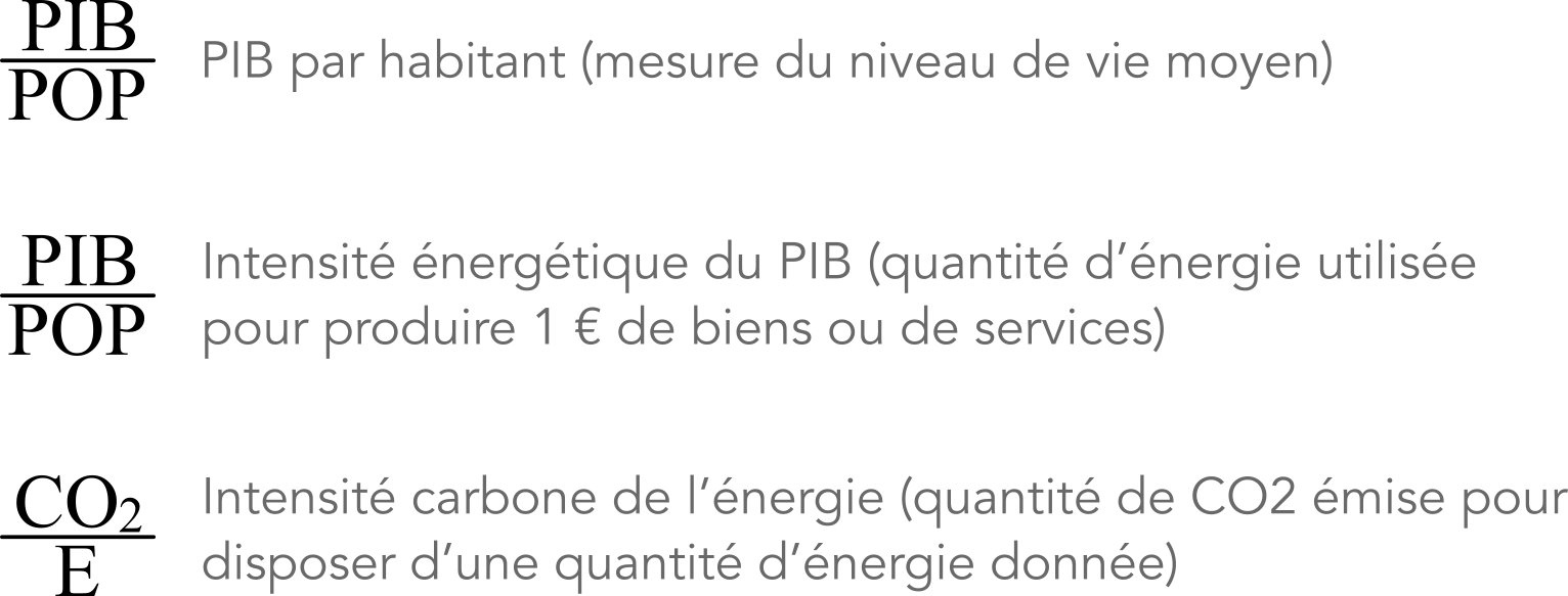 L’équation de Kaya relie les émissions anthropiques* de dioxyde de carbone (CO2) à des paramètres d’ordre démographique, économique et énergétique.