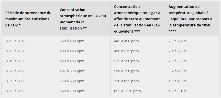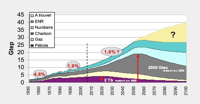 Aujourd’hui, près de 80 % de la consommation mondiale d’énergie est d’origine fossile. Nous n’avons pas encore atteint le pic d’exploitation des hydrocarbures en raison de la recherche et de l’exploitation de nouveaux gisements (offshore profond, fracturation hydraulique, sables bitumineux, etc.). Même une fois celui-ci atteint, la décroissance des émissions de gaz à effet de serre ne se fera que progressivement. En conséquence, plus le pic sera tardif, plus le réchauffement climatique sera important pouvant même dépasser 6°C s’il intervient après 2050. Par comparaison, l’écart le plus important entre les périodes glaciaires et interglaciaires passées a été de 5°C au maximum.